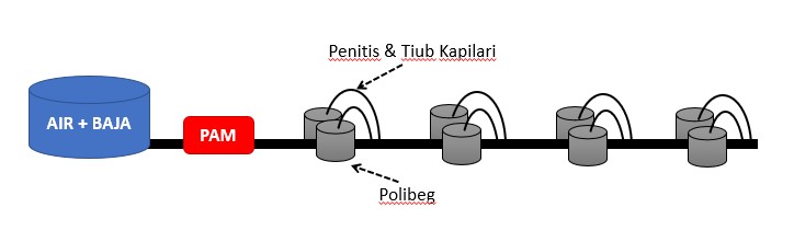 Sistem ini menjadi penghubung diantara sistem tangki dan juga polibag. Komponen ini diperlukan untuk mengalirkan air yang disimpan di dalam sistem tangki air kepada tanaman di dalam polibag.